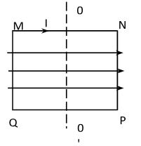 Câu 4: Để tạo ra dòng điện xoay chiều người ta cho một khung dây dẫn phẳng MNPQ gồm 50 vòng dây, mỗi vòng dây có diện tích 100cm², quay đều với tốc độ $\frac{3000}{\pi}$ vòng/ phút quanh trục OO’ vuông góc với đường sức từ của từ trường đều có cảm ứng từ bằng 0,2T như hình vẽ.