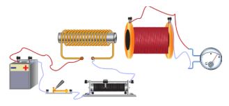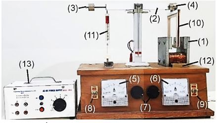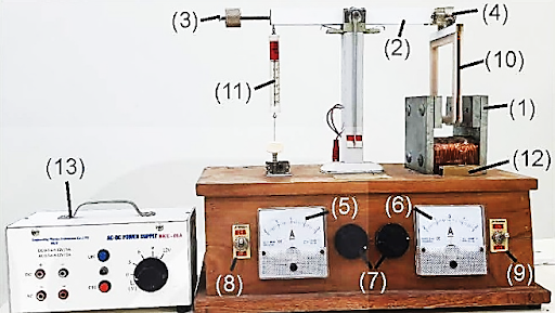 - Bật công tắc nguồn điện cho dòng điện chạy qua nam châm điện, và bật công tắc để dòng điện chạy qua khung dây ban đầu để ở 0,1 A. xác định độ lớn lực từ qua lực kế.