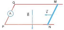 Câu 1. Thí nghiệm với thanh kim loại MN dài 20cm trượt trên hai đoạn dây dẫn điện MQ và NP được nối với ampe kế thành mạch điện kín như Hình vẽ. Mạch điện được đặt trong từ trường đều có cảm ứng từ B=50 mT và vuông góc với mặt phẳng MNPQ điện trở tổng cộng của khung dây là 2 Ω.