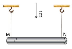 Câu 3. Treo đoạn dây dẫn có chiều dài $l = 5$ cm, khối lượng $m = 5$ g bằng hai dây mảnh, nhẹ sao cho dây dẫn nằm ngang. Biết cảm ứng từ của từ trường hướng thẳng đứng xuống dưới, có độ lớn $B = 0,5$ T và dòng điện đi qua dây dẫn là $I = 2$ A. Nếu lấy $g = 10$ m/s² thì góc lệch $\alpha$ của dây treo so với phương thẳng đứng là bao nhiêu độ?