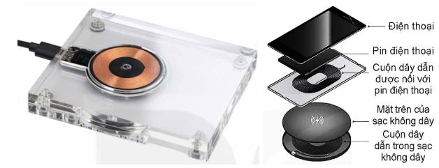 Câu 4. Sạc điện thoại không dây hoạt động dựa trên hiện tượng cảm ứng điện từ như máy biến áp. Ở trên sạc có cuộn dây được nối với dòng điện xoay chiều, dòng vai trò như cuộn sơ cấp. Phía sau của điện thoại có cuộn dây được nối với pin, dòng vai trò như cuộn thứ cấp.