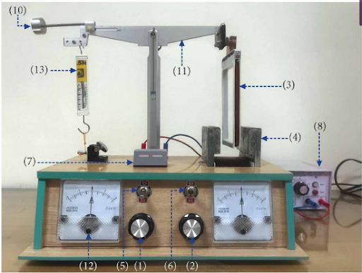 Câu 16. Trong thí nghiệm đo độ lớn cảm ứng từ của từ trường nam châm điện bằng cân “dòng điện” được bố trí như hình bên, không có dụng cụ nào dưới đây: