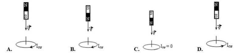 Câu 3. Hình vẽ nào sau đây xác định đúng chiều dòng điện cảm ứng khi cho nam châm rơi thẳng đứng xuống tâm vòng dây đặt trên bàn?