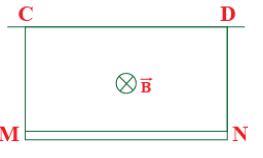 Câu 1. (1 điểm) Thanh MN dài $l = 20$ cm, có khối lượng 5 gam treo nằm ngang bằng hai sợi chỉ mảnh CM và DN. Thanh nằm trong từ trường đều có cảm ứng $B = 0,3$ T nằm ngang vuông góc với thanh có chiều như hình vẽ.