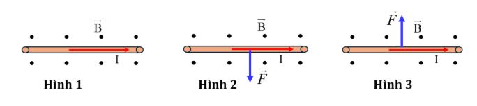 Câu 1. Một dây dẫn dài 20 cm mang dòng điện $I = 8$ A, được đặt vuông góc với một từ trường đều như hình 1 bên dưới. Biết lực từ tác dụng lên dây dẫn là $F = 3,5$ N. Các phát biểu sau đúng hay sai?