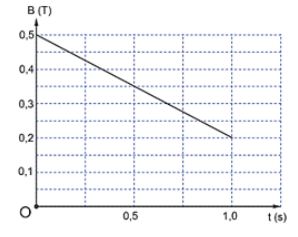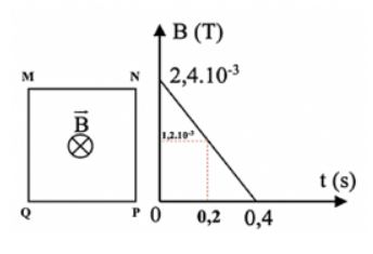 Câu 2: Một khung dây dẫn kín hình vuông có cạnh dài 10 cm gồm 500 vòng được đặt trong từ trường đều sao cho véc tơ pháp tuyến của mặt phẳng khung dây cùng phương cùng chiều với véc tơ cảm ứng từ. Điện trở suất và tiết diện của dây kim loại có giá trị lần lượt là $\rho = 2 \cdot 10^{-8} \Omega m$ và $0,4$ mm$^2$. Giá trị cảm ứng từ biến thiên theo thời gian như đồ thị trong hình bên dưới.