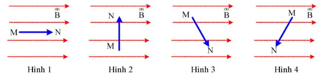Câu 2: Trong hình vẽ đoạn dòng điện MN đặt trong mặt phẳng chứa các đường sức từ của một từ trường đều ở các vị trí khác nhau. Độ lớn lực từ tác dụng lên đoạn dòng điện MN trong hình số mấy là bé nhất?