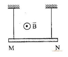Câu 1: Treo đoạn dây dẫn MN dài 25cm, khối lượng một đơn vị chiều dài 0,04kg/m bằng hai dây mảnh nhẹ sao cho dây dẫn nằm ngang. Biết cảm ứng từ có chiều như hình vẽ, độ lớn $B = 0.04$ T. Lấy $g = 10$ m/s$^2$