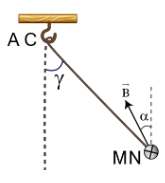 Câu 2. Một thanh kim loại MN có chiều dài $\ell = 4,0 cm$ và khối lượng $m = 4,0 g$ được treo thẳng ngang bằng hai dây kim loại, nhẹ, cứng song song cùng độ dài AM và CN trong từ trường đều. Cảm ứng từ của từ trường này có độ lớn $B = 0,1 T$, hướng vuông góc với thanh MN và chếch lên phía trên hợp với phương thẳng đứng một góc $\alpha = 60^\circ$. Lúc đầu, hai dây treo AM và CN nằm trong mặt phẳng thẳng đứng. Sau đó, cho dòng điện cường độ 10 A chạy qua thanh MN có chiều hướng từ ngoài vào trong. Lấy $g = 10 m/s^2$. Gọi $\gamma$ là góc lệch của mặt phẳng chứa hai dây treo AM và CN so với mặt phẳng thẳng đứng. Giá trị $\gamma$ bằng bao nhiêu độ?