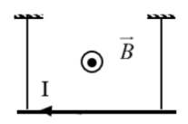 Câu 1. Một đoạn dây dẫn thẳng có chiều dài $l = 80 \text{cm}$, có dòng điện không đổi có cường độ I chạy qua được treo bằng 2 sợi dây mành sao cho đoạn dây dẫn mang dòng điện nằm ngang, vuông góc với từ trường đều có chiều như hình vẽ, khối lượng dây dẫn là 2 g. Biết độ lớn cảm ứng từ $B = 45 \text{mT}$, gia tốc rơi tự do $g = 9,8 \text{m/s}^2$. (Bỏ qua ảnh hưởng của từ trường Trái Đất tác dụng lên dây dẫn).