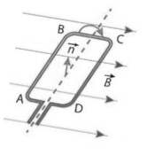 Câu 2. Để tạo ra dòng điện xoay chiều ta cho một khung dây dẫn phẳng ABCD gồm 100 vòng dây, mỗi vòng có diện tích $S = 400 \text{cm}^2$, quay đều với tốc độ 120 vòng/phút, quanh một trục vuông góc với các đường sức của một từ trường đều có cảm ứng từ $B = 0,5 \text{T}$. Như hình bên. Xét tính đúng/sai của các nhận định sau: