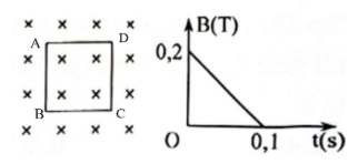 Câu 3. Một từ trường đều vuông góc với mặt phẳng hình vẽ có độ lớn cảm ứng từ B giảm đều theo thời gian t. Một khung dây cứng (có một vòng dây) hình vuông ABCD có diện tích $0,04 \text{m}^2$, có điện trở $0,1 \Omega$ được đặt trong từ trường và nằm trên mặt phẳng hình vẽ (như hình vẽ bên dưới).