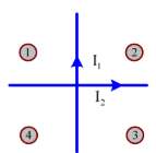 a) Học sinh này bố trí hai dây dẫn thẳng đặt vuông góc với nhau trong cùng một mặt phẳng thẳng đứng và có các dòng điện không đổi $I_1, I_2$ chạy qua như hình vẽ. Học sinh này cho rằng trong miền (2) và (4) từ trường do $I_1, I_2$ tạo ra có vectơ cảm ứng từ ngược hướng nhau.