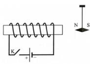 d) Học sinh này đã thiết kế thí nghiệm gồm một mạch điện và kim nam châm được treo như hình vẽ. Khi đóng công tắc K thì kim nam châm sẽ bị đẩy sang trái.