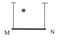 Câu 3(1,0 điểm): Một đoạn dây dẫn MN có chiều dài 30 cm, được treo bằng hai sợi dây mành, nhẹ không dãn sao cho dây dẫn nằm ngang. Khối lượng trên một đơn vị chiều dài của dây dẫn là $0,05 \text{kg/m}$. Biết vectơ cảm ứng từ $\vec{B}$ có chiều như hình vẽ, có độ lớn $B = 0,04 \text{T}$. Dòng điện qua dây dẫn có cường độ $I = 5 \text{A}$ và có chiều từ $N$ đến $M$. Lấy $g = 10 \text{m/s}^2$, tính lực căng của mỗi dây treo?