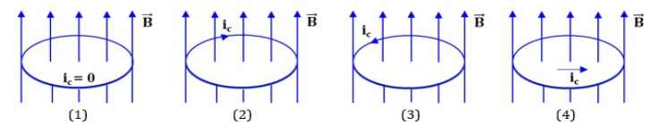 Câu 13. Một vòng dây dẫt có đinh trong từ trường đều. Khi độ lớn cảm ứng từ B giảm thì hình vẽ nào xác định đúng chiều dòng điện cảm ứng?