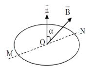 Câu 2. Một khung dây hình tròn diện tích S = 20cm² gồm N = 10 vòng dây, đặt trong từ trường đều có $\vec{B}$ hợp với vector pháp tuyến $\vec{n}$ của mặt phẳng khung dây một góc α = 60° như hình vẽ. Biết cảm ứng từ B = 0,04T.