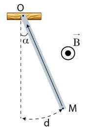 Câu 6. Một thanh dẫn điện đồng chất có khối lượng m = 10 g, dài $ℓ = 1m$ được treo trong từ trường đều có cảm ứng từ $\vec{B}$ vuông góc với mặt phẳng hình vẽ, chiều từ trong ra ngoài. Đầu trên O của thanh có thể quay tự do xung quanh một trục nằm ngang. Khi cho dòng điện cường độ $I = 8A$ qua thanh thì đầu dưới M của thanh di chuyển một đoạn d = 2,56cm. Lấy $g = 10 m/s²$. Độ lớn cảm ứng từ B bằng bao nhiều mT?