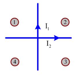 Câu 1: Trong miền nào giữa hai dây dẫn thẳng đặt vuông góc với nhau trong cùng một mặt phẳng thẳng đứng và có các dòng điện không đổi $I_1, I_2$ chạy qua như hình vẽ sẽ tạo ra các từ trường cùng hướng?