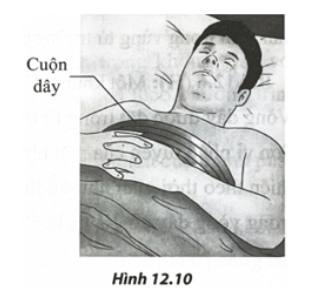 Câu 5: Để giảm sát quá trình hô hấp của bệnh nhân, các nhân viên y tế sử dụng một dải móng gồm 250 vòng dây kim loại quấn liền tiếp nhau được buộc xung quanh ngực của bệnh nhân như Hình 12.10.Khi bệnh nhân hít vào, diện tích của các vòng dây tăng lên một lượng 45 cm². Biết từ trường Trái Đất tại vị trí đang xét được xem gần đúng là đều và có độ lớn cảm ứng từ xấp xỉ 56 μT, các đường sức từ hợp với mặt phẳng cuộn dây một góc 32°. Giả sử thời gian để một bệnh nhân hít vào là 1,5 s. Độ lớn suất điện động cảm ứng trung bình sinh ra bởi cuộn dây trong quá trình nói trên là bao nhiều millivôn (mV)? ( Làm tròn kết quả đến chữ số hàng phần trăm)