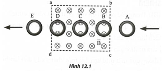 Câu 12: Xét một vòng kim loại đang chuyển động đều từ A đến E như Hình 12.1. Trong quá trình chuyển động, vòng đi vào vùng từ trường đều abcd có các đường sức từ vuông góc với mặt phẳng vòng dây. Trong quá trình chuyển động, số lượng đường sức từ xuyên qua vòng kim loại này giảm dần trong giai đoạn nào?