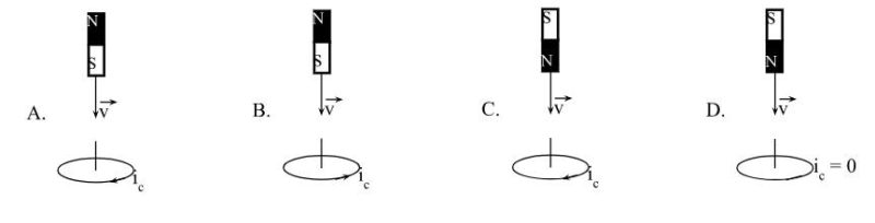Câu 14: Hình vẽ nào sau đây xác định đúng chiều dòng điện cảm ứng khi cho nam châm rơi thẳng đứng xuống tâm vòng dây đặt trên bàn?