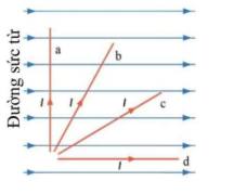Câu 4: Bốn đoạn dây dẫn a, b, c, d có cùng chiều dài được đặt trong từ trường đều (hình bên). Các dòng điện chạy trong bốn đoạn dây dẫn này có cùng cường độ I. Lực từ tác dụng lên đoạn dây dẫn nào là mạnh nhất?