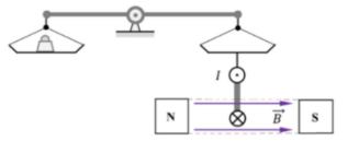 Câu 3. Một khung dây dẫn hình vuông, cạnh a = 10 cm có 200 vòng dây. Khung được treo thẳng đứng dưới một cần. Cạnh dưới của khung nằm trong từ trường đều của nam châm chữ U và vuông góc với vector cảm ứng từ như hình vẽ. Sau khi thiết lập trạng thái cân bằng cho các địa cân, người ta cho dòng điện có cường độ I = 0, 5 A chạy qua khung dây. Biết cảm ứng từ giữa hai cực của nam châm là B = 0,002 T. Lấy g = 10m / s² ). Phải thêm ở đĩa cân bên kia một khối lượng bằng bao nhiêu để cân thăng bằng ( Kết quả tính bằng gam )?