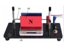 Câu 4. Một học sinh sử dụng bộ thí nghiệm như hình vẽ để đo cảm ứng từ giữa hai nhánh của nam châm chữ U (kết quả lấy đến hàng đơn vị là millitesla). Trong đó: (1) là dây dẫn thẳng mang dòng điện I có chiều dài 15 cm có thể đo bằng ampe kế; (2) là nam châm chữ U có chiều dài 8,4 cm với cực Bắc ở mặt trước; (3) là cân đồng hồ hiện số. Lấy gia tốc rơi tự do g = 9,8 m/s². Ban đầu, khi I = 0, số chỉ của cân là 164,40gam. Khi cho dòng điện chạy qua đoạn dây, học sinh thu được các số liệu ghi ở bảng bên: