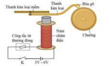 Câu 13. Hình bên là một mô hình về chuông điện. Nguyên tắc hoạt động của chuông điện là khi công tắc đóng, từ tính nam châm điện xuất hiện…(1)…thanh kim loại, từ đó búa gõ đập vào…(2)…phát ra âm thanh. Chỗ trống (1) và (2) lần lượt là