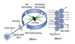 Câu 2. Trong thí nghiệm tán xạ hạt α, chùm hạt α có động năng lớn phát ra từ nguồn phóng xạ được bắn vào lá vàng mỏng như hình a. Kết quả cho thấy hầu hết các hạt α đi thẳng nhưng có một số ít hạt bị lệch so với hướng truyền ban đầu (bị tán xạ) với các góc lệch khác nhau như hình b.