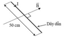 Câu 2. Một dây dẫn nằm ngang dài 50 cm mang dòng điện cường độ 3,0 A đặt vuông góc với vector cảm ứng từ $\vec{B}$ của một từ trường đều như hình bên. Biết vector cảm ứng từ $\vec{B}$ có phương nằm ngang và độ lớn 0,05 T. Lực từ tác dụng lên đoạn dây có