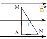 Câu 1 (0,5 điểm): Một dây dẫn được uốn thành một khung dây có dạng tam giác vuông tại A, với AM = 4 cm, AN = 3 cm có dòng điện với cường độ I = 5 A chạy qua. Đặt khung dây vào trong từ trường đều có B = $3.10^{-3}$ T, vector cảm ứng từ song song với cạnh AN như hình vẽ. Giữ khung dây cố định. Tính độ lớn lực từ tác dụng lên các đoạn dây AN và MN?