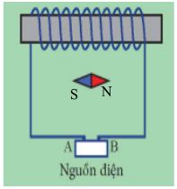 Câu 3. Xét một ống dây có dòng điện chạy qua và một nam châm thử định hướng như hình vẽ. A, B là các cực của nguồn điện không đổi. Chọn phát biểu không đúng.